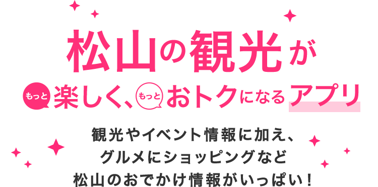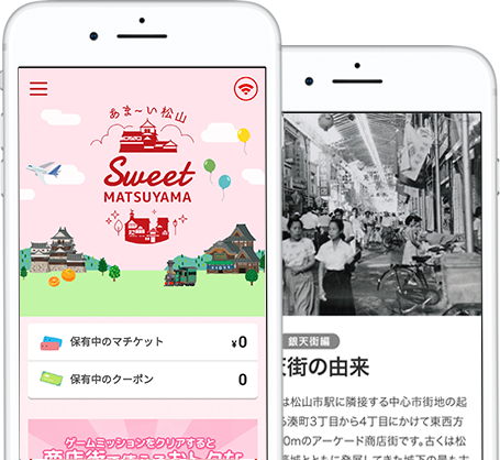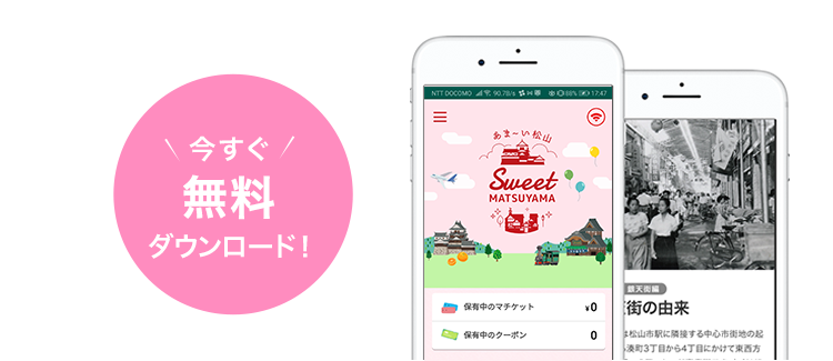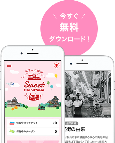 スウィート松山アプリには、メールアドレスを登録するだけで、ご利用いただける無料のWi-Fiに、簡単に接続することができる機能を搭載しています。松山にご滞在中のスマートフォンのご利用の際には、ぜひご活用ください。